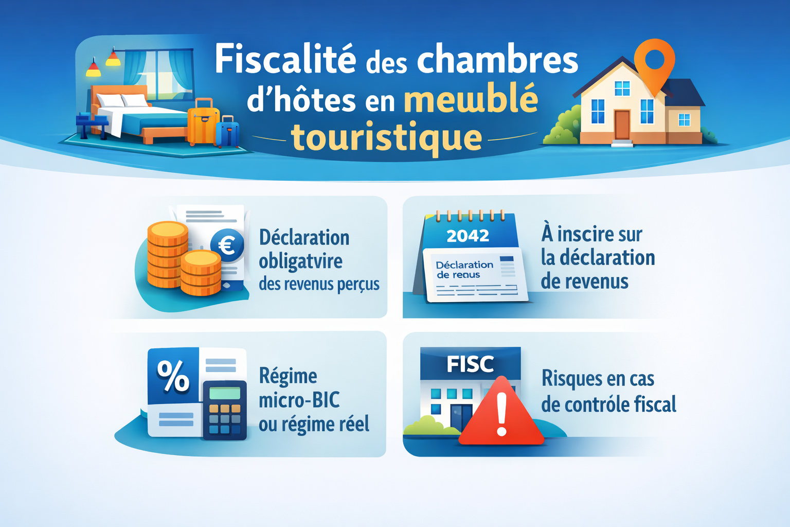 L’exploitation d’une chambre d’hôtes ou d’un meublé de tourisme séduit de nombreux propriétaires en quête de revenus complémentaires. Oui, les revenus issus de la location d’une chambre d’hôtes ou d’un meublé de tourisme doivent obligatoirement être déclarés aux impôts. Ces revenus locatifs sont soumis à l’impôt sur le revenu et entrent dans la catégorie des bénéfices industriels et commerciaux (BIC). Le régime fiscal applicable dépend du montant des recettes annuelles perçues. Découvrons ensemble les obligations déclaratives et les différents régimes fiscaux qui s’appliquent à votre activité.